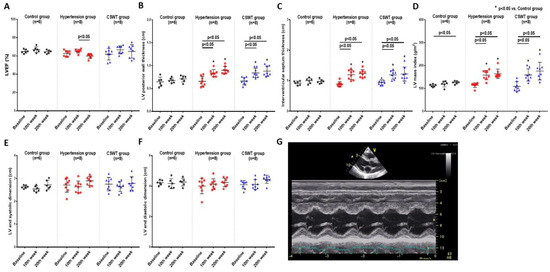Echocardiographic data. Echocardiographic parameters at baseline, 10th week and 20th week follow−up in control, hypertension and CSWT groups. (A). No significant difference of LVEF (left ventricular ejection fraction) was observed in control and CSWT groups throughout the whole experiment. At the 20th week, LVEF decreased in hypertension group compared with that at the 10th week. (B,C). After induction of hypertension, LV (left ventricle) posterior wall thickness and interventricular septum thickness increased significantly in hypertension and CSWT groups at the 10th week and 20th week compared with those at baseline and in the control group. (D). LV mass index increased significantly in hypertension and CSWT groups compared with that of control group at the 10th week and 20th week. (E,F). No significant difference of LV end systolic dimension and LV end diastolic dimension were observed among the three groups throughout the whole experiment. (G). Representative echocardiographic M−mode tracing. Two−way repeated ANOVA with Tukey’s test was used, * p < 0.05 versus control group.
