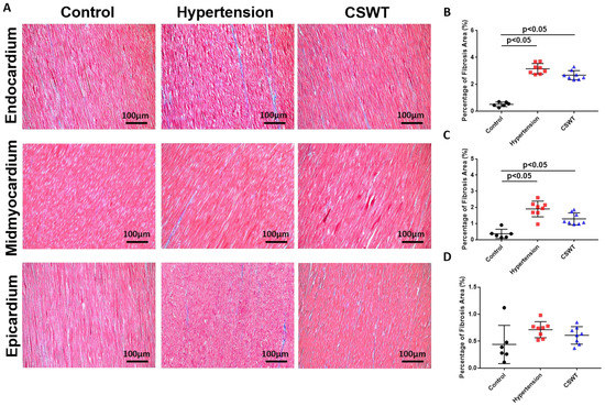 Fibrosis level was detected by Masson’s trichrome staining for the three groups at the 20th week (Figure 4A). A significant increase in area-percentage of fibrosis at the endocardium and mid-myocardium was observed in the hypertension group and CSWT group compared with the control group (Figure 4B,C). No significant difference in the degree of fibrosis was observed in the epicardium among the three groups (Figure 4D).