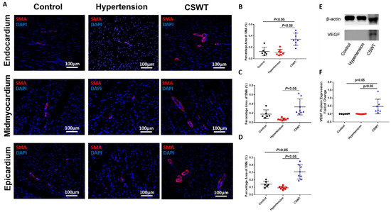 Angiogenesis effect of CSWT at the 20th week. Immunohistological staining of heart sections in the three groups at the 20th week. (A). Microvascular density in endocardium, midmyocardium and epicardium were assessed by immunofluorescence staining with SMA (smooth muscle actin) in the three groups. (B–D). There were no significant differences of positive−SMA staining in hypertension group compared with control group among three layers of myocardium. Additionally, CSWT significantly improved SMA−positive microvascular density compared with hypertension group in three layers of myocardium. (E). Representative Western blot analysis of VEGF (vascular endothelial growth factor) expression in three groups at the 20th week. (F). VEGF was significantly higher in CSWT group compared with control and hypertension groups. There was no significant difference of VEGF expression between control and hypertension groups. Independent Student t−test was used.
