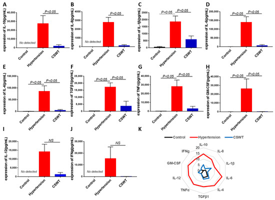 Anti-inflammatory effect of CSWT at the 20th week. The level of circulating cytokines was detected using cytokine array in the control, hypertension and CSWT groups (N = 4 for each group) at the 20th week. (A–J). After induction of hypertension, expression of IL-1β, IL-6, IL-4, TGFβ1, TNFα and GM-CSF significantly increased in hypertension group compared with control group, and the level of expression of IL-10, IL-8, IL-12 and IFNg was not detected in the control group. Expression of IL-10, IL-8, IL-1β, IL-6, IL-4, TGFβ1, TNFα and GM-CSF significantly decreased in the CSWT group compared with the hypertension group. There was no significant difference of expression of IL-12 and IFNg between hypertension group and CSWT group. (K). Expression of cytokines was detected using cytokine array in the control, hypertension and CSWT groups at the 20th week. Independent Student t-test and one-way ANOVA were used. NS: not significant.