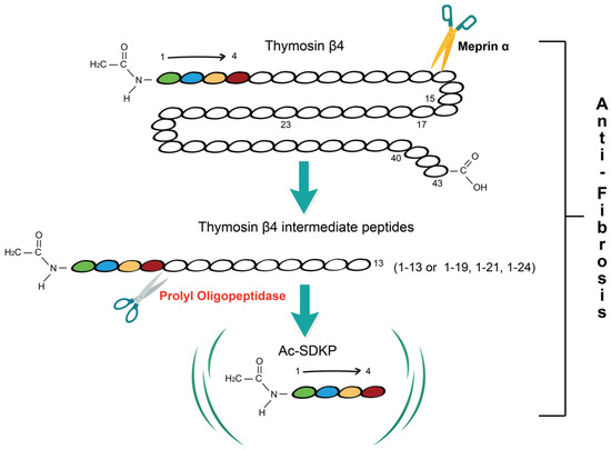 - Kumar, N.; Nakagawa, P.; Janic, B.; Romero, C.; Worou, M.E.; Monu, S.R.; Peterson, E.L.; Shaw, J.; Valeriote, F.; Ongeri, E.M.; et al. The anti-inflammatory peptide Ac-SDKP is released from thymosin-β4 by renal meprin-α and prolyl oligopeptidase. Am. J. Physiol.-Renal Physiol. 2016, 310, F1026–F1034. [Google Scholar] [CrossRef]