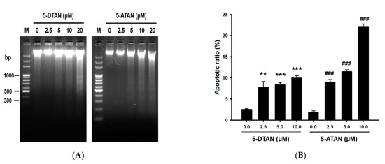 PC-3 cells were seeded in 96-well plates at a density of 2.5 × 103 cells/well and allowed to attach for 24 h. The medium was changed to serum-free RPMI supplemented with 0–20 μM TAN, 5-DTAN, or 5-ATAN, and then incubated for an additional 48 h. The cell viability was determined by the MTT assay and represented as a percentage of the growth of the DMSO-treated cells. FACScan flow cytometer (Becton Dickinson, San Jose, CA, USA) was used to analyze the cell cycle distribution as previously mentioned [45]. Briefly, PC-3 cells treated with various concentrations of 5-DTAN or 5-ATAN for 48 h were trypsinized and gently fixed in 70% ice-cold ethanol and stored at −20 °C for at least 24 h. Then, the cells were washed with cold phosphate-buffered saline (PBS), followed by incubation with 40 μg/mL PI, 0.1 mg/mL RNase A, and 0.1% TritonX-100 in the dark for 30 min at room temperature. Subsequently, the cell cycle distribution of the PI-stained cells was analyzed by a FACScan flow cytometer, and the results were analyzed and calculated using ModFit LT Ver. 3.0 software. The proportion of the sub-G1 phase was quantitated and represented as the apoptotic ratio. Furthermore, a QIAamp DNA mini kit was used to extract DNA from the PC-3 cells treated with 5-DTAN or 5-ATAN for 48 h. Then, the extracted DNA was loaded on a 2% agarose gel containing HealthViewTM Nucleic Acid Stain (Genomics, New Taipei, Taiwan) for electrophoresis at 50 V. The gel was visualized under UV light, and the DNA fragmentation pattern was photographed.