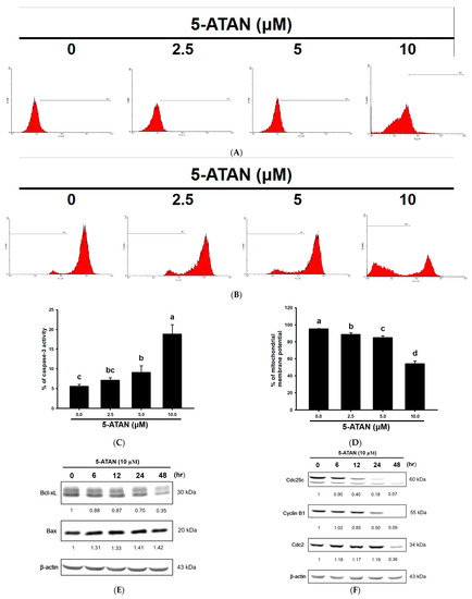 Effects of 5-ATAN on the mitochondrial pathway and cell cycle checkpoint protein expression in PC-3 cells. Cells were treated with various concentrations of 5-ATAN for 48 h or 10 µM of 5-ATAN for different time periods. (A) Caspase-3 activity. (B) Mitochondrial membrane potential was then analyzed by flow cytometry. (C,D) Data were expressed as mean ± SD of three determinations presented in the bar graph and analyzed statistically using ANOVA and Duncan’s test. Different letters represent statistical differences among treatments, p < 0.05. The protein expression of (E) Bcl-xL and Bax, (F) Cdc25c, Cyclin B1, and Cdc2 were analyzed by Western blot.