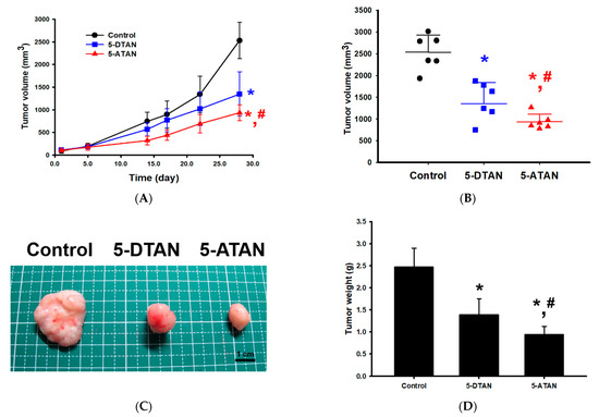Effects of oral administration of 10 mg/kg 5-DTAN and 5-ATAN on the tumor growth of PC-3 cell xenografts. (A) The changes in tumor volume on the right flank side of nude mice as a function of time. (B) Tumor size at the end of the experiment. (C) The appearance of representative tumors harvested at the end of the experiment. (D) Mean tumor weight in nude mice. Data are expressed as means ± SD (n = 6). * p < 0.05 compared with control group. # p < 0.05 compared with 5-DTAN group.