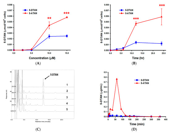 Cellular uptake and oral bioavailability of 5-DTAN. (A) Cytosolic concentrations of 5-DTAN in PC-3 cells treated with various concentrations of 5-DTAN or 5-ATAN for 12 h, (B) with 15 µM of 5-DTAN or 5-ATAN for different time periods. Data are expressed as means ± SD (n = 3). ** p < 0.01 and *** p < 0.001 compared with 5-DTAN-treated group. (C) Representative HPLC chromatograms of standard stock (1), plasma after administration of 5-ATAN (2–4), and blank plasma (5). (D) Mean plasma concentration-time curves of 5-DTAN after oral administration of 50 mg/kg of 5-DTAN or 5-ATAN to C57BL/6J mice.