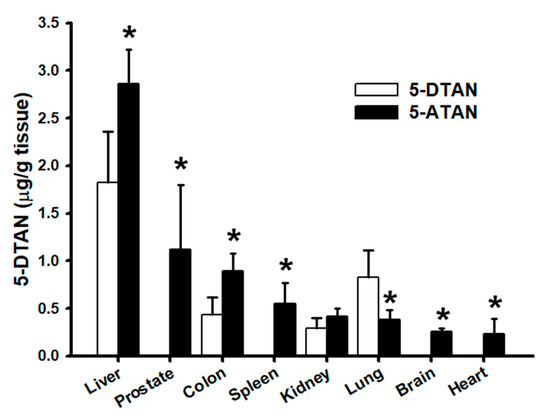 Tissue distribution of 5-DTAN in C57BL/6J mice following oral administration of 50 mg/kg of 5-DTAN or 5-ATAN for 7 consecutive days. Data are expressed as means ± SD (n = 6). * p < 0.05 compared with 5-DTAN-administered group.