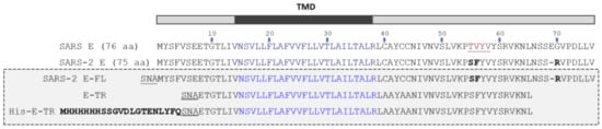 - Parthasarathy, K.; Lu, H.; Surya, W.; Vararattanavech, A.; Pervushin, K.; Torres, J. Expression and purification of coronavirus envelope proteins using a modified beta-barrel construct. Protein Expr. Purif. 2012, 85, 133–141. [Google Scholar] [CrossRef]