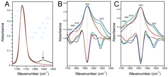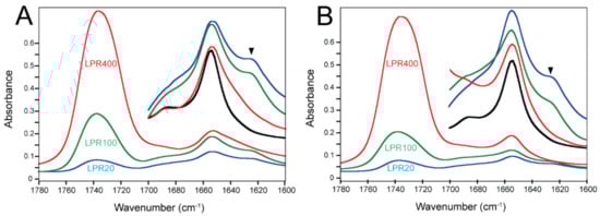 We also note that this increase in the β-structure does not seem to occur at the expense of the α-helical content (1654 cm−1), since the latter did not change significantly at the different LPRs (Figure 7B–C). Moreover, the minima corresponding to the amide II (1550 cm−1, representing total protein content) and the α-helix (1654 cm−1) in the second derivative spectra of the samples of LPR20 and LPR400 showed a constant ratio (not shown). Thus, we believe that the increase at ~1620–1635 cm−1 seems to be at the expense of a band at higher wavenumbers, at around 1680–1690 cm−1. The origin of this absorption is uncertain, although it is usually assigned to the β-turns [32,33].
