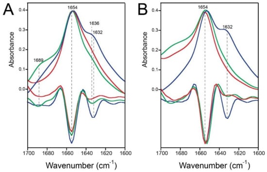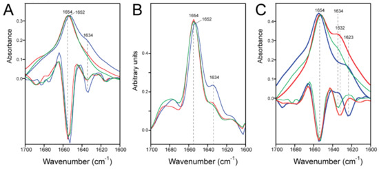 The amide I band envelope was decomposed into its components using a combination of peak fitting and second-derivative calculation [39]. Briefly, the spectra were smoothed with a 9 cm−1 window and the second and fourth derivatives of the spectra were calculated using OMNIC. The amide I envelope was curve-fitted as a sum of Voigt peaks in Fityk [40], where the initial guess of the positions of these peaks were determined using the minima (in the second-derivative spectra) and the maxima (in the fourth-derivative spectra). The goodness of the fit was further determined by comparing the second derivative of the fitted spectra with that of the original spectra.