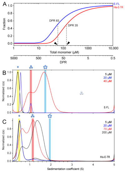 The AUC sedimentation equilibrium (AUC-SE) of these two constructs has been performed previously in C14-betaine [18,19]. Using the reported affinity constant (Ka) values, the mid-point of pentamer formation is at a detergent-to-protein ratio (DPR) of 85 in E-FL and 35 in His-E-TR (Figure 5A). Therefore, 50% pentamerization is obtained at a more diluted protein concentration in E-FL than in His-E-TR; i.e., E-FL forms more stable oligomers than His-E-TR, consistent with our hypothesis.