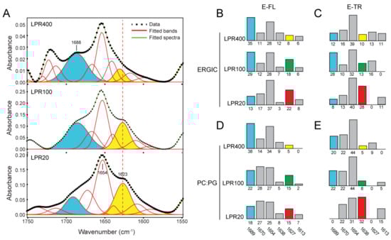 Amide I analysis of E-FL. (A) Representative curve-fitting of the amide I band of E-FL in ERGIC lipids at three LPRs indicated. The band assigned to β-structure is highlighted in yellow and the band at 1688 cm−1 in blue; (B–E) histograms representing areas under each amide I band used in the curve-fitting. The numbers at the bottom represent the center of each band (in wavenumbers), and the numbers next to the axis are the area percentages. Percentages are shown for E-FL in ERGIC (B) and mixture PC:PG (C). The band representing β-structure is shown in red (LPR20), green (LPR100), and yellow (LPR400), whereas the band at higher frequency is shown in blue, as in panel (A); (C,D) are same as (B,C), for E-TR.
