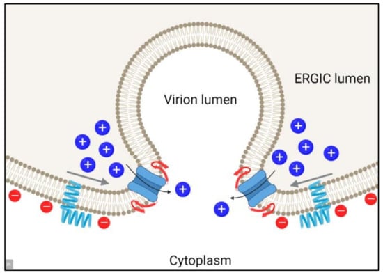 Schematic representation of the possible role of SARS-2 E protein in neck scission. The drawing represents the formation of a virion inside the lumen of the ERGIC. E protein is represented schematically by α-helical fragments (blue) when monomeric, whereas migration (arrows) and clustering into convex regions of the membrane trigger a conformational change at the C-terminal domain (red), which may insert in cis or trans (opposite) into the membrane, contributing to membrane destabilization. Ca2+ ions are represented by blue dots and lipid negative charges by red dots. Created with BioRender.com.