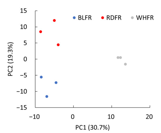PCA of metabolic profiles in fruits with different light treatments. PCA scores are presented based on a combination of the first (PC1) and second (PC2) principal components and variances of each component in the sample set. BLFR, RDFR, and WHFR refer to blue, red, and white light-treated fruits.