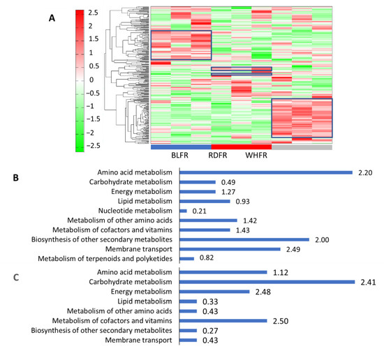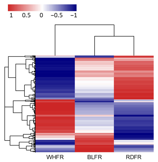 The significant results with |fold change (FC)| ≥ 2 were selected and used for hierarchical clustering, volcano plots, and enrichment analyses. In total, 95, 170, and 379 genes were selected in BLFR vs. RDFR, BLFR vs. WHFR, and RDFR vs. WHFR, respectively. For significant lists, HCA was performed to group similar samples and genes. These results were graphically depicted using heatmaps and dendrograms. The heat map indicated significantly different patterns in gene expression among the three treatments (Figure 8). Log2 FC and p-value were obtained from the comparison between two groups, such as BLFR and RDFR, plotted as volcano plot (Figure S3). In BLFR vs. RDFR, upregulated genes were more than downregulated genes, and a similar pattern could also be found in BLFR vs. WHFR. These results indicated that the expression of more genes was improved in blue light treatment. A microarray study in Arabidopsis exhibited similar results that changes in expression of ~20% transcriptional factors were found in response to blue light; moreover, upregulated genes were more than downregulated genes [36].