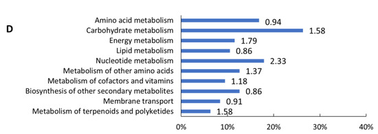 With regard to gene expression, 11 differently expressed genes were enriched in the biosynthesis of secondary metabolites in BLFR vs. RDFR. More than twofold differences in the expression levels were detected between the two light qualities (Table 1 and Table S1). Among them, the products of serine hydroxymethyltransferase 4 (SHMT) and glycerate dehydrogenase reactions are utilized in many crucial biosynthetic pathways, such as photorespiratory cycle, carbohydrate, and amino acid metabolism [74,75,76]. SHMT catalyzes the reversible exchange between serine and glycine, and a mitochondrial SHMT gene mutation in rice results in the blockage of the photorespiration pathway, thereby affecting the Calvin cycle and the efficiency of light energy [77]. These could be related to active carbon fixation under blue light (Table 1). SHMT is also important for generating one-carbon fragments for synthesizing nucleotides, methionine, thymidylate, choline, etc. [78]. Glycerate dehydrogenase is involved in the one-carbon metabolism as well. Glycerate dehydrogenase is a peroxisomal enzyme that catalyzes the NADH-dependent reduction of hydroxypyruvate into serine in the nonphosphorylated (glycerate) serine pathway [79]. The two differentially expressed genes are involved in glycine, serine, and threonine metabolism, which was active in BLFR (Table 1).