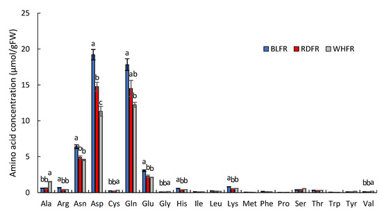 Amino acid concentration in fruits with different light treatments. Values indicate the mean ± standard error (SE; n = 3). Different letters indicate significant differences at p < 0.05 by Tukey’s test. BLFR, RDFR, and WHFR refer to blue, red, and white light-treated fruits, respectively.