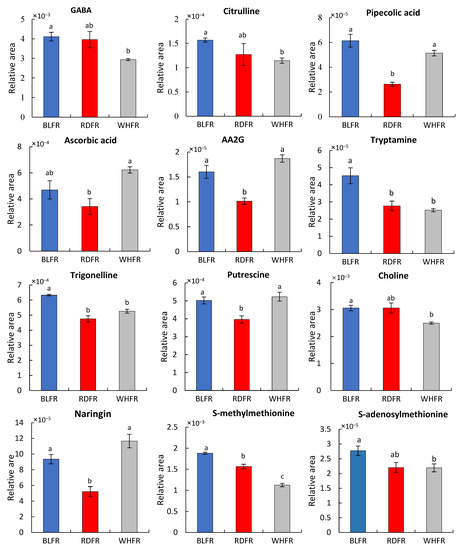 GABA, citrulline, pipecolic acid, ascorbic acid, AA2G, tryptamine, trigonelline, putrescine, choline, naringin, S-methylmethionine, and S-adenosylmethionine concentration in fruits treated with different lights. Values indicate the mean ± SE (n = 3). Different letters indicate significant differences at p < 0.05 by Welch’s t-test. BLFR, RDFR, and WHFR refer to blue, red, and white light-treated fruits, respectively.