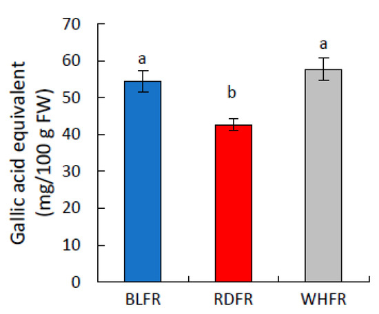 Influence of light quality on the total phenol concentration in fruits. Results are the mean ± SE (n = 3). Different letters indicate significant differences at p < 0.05 by Tukey-Kramer’s test. BLFR, RDFR, and WHFR refer to blue, red, and white light-treated fruits, respectively.