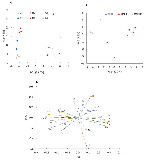 PCA of element concentration in leaves and fruits (A). BL and BF, blue-light-treated leaves and fruits; RL and RF, red light-treated leaves and fruits; WL and WF, white light-treated leaves and fruits. PCA (B) and factor loading (C) of element concentration in fruits. BLFR, RDFR, and WHFR refer to blue, red, and white light-treated fruits, respectively.