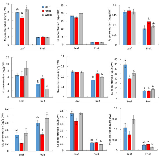 Mg, Ca, Fe, Ni, Rb, Cu, Mo, Co, and V concentrations of leaves and fruits treated with different lights. Values indicate the mean ± SE (n = 3). Different letters indicate significant differences at p < 0.05 by Tukey-Kramer’s test. BLFR, RDFR, and WHFR refer to blue, red, and white light treatments, respectively.