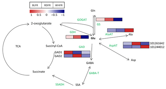 Transcriptomic profiles of genes involved in the Glu metabolism pathway. Red and blue rectangles indicate higher and lower levels, respectively, than the mean of all treatments. Values indicate the z-score in the legend. The experimental data were subjected to an independent t-test at p < 0.05. Significant differences are found in the transcription level of GDH in RDFR vs. WHFR, GAD1 in BLFR vs. others, GAD2 in RDFR vs. others, AspAT (Gene ID: 101261642) in RDFR vs. WHFR, AspAT (Gene ID: 101244012) in WHFR vs. others, AlaAT in RDFR vs. WHFR, and GS in RDFR vs. WHFR. BLFR, RDFR, and WHFR refer to blue, red, and white light-treated fruits, respectively.