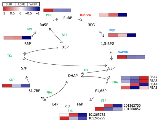 Transcriptomic profiles of carbon fixation (red), reduction (blue), and regeneration phase (green) and metabolic profiles of the Calvin cycle. Significant differences and >2 FC were found in the transcription level of PRK, FBP (Gene ID: 101260852), FBA3, and GAPDH in BLFR vs. RDFR. Significant differences and >2 FC were found in the transcription level of PRK, FBP (Gene ID: 101260852), GAPDH, SBP, and TKL (Gene ID: 101245299) in BLFR vs. WHFR. Significant differences and >2 FC were found in the transcription level of rbcL in RDFR vs. WHFR. Red and blue rectangles indicate higher and lower levels, respectively, than the mean of all treatments. Values indicate the z-score in the legend. Sedoheptulose 7-phosphate (S7P), ribose 5-phosphate (R5P), ribulose 5-phosphate (Ru5P), xylulose 5-phosphate (X5P), 3-phosphoglyceric acid (3-PG), dihydroxyacetone phosphate (DHAP), and fructose 1,6-diphosphate (F1,6BP) concentration in fruits treated with different light treatments. Values indicate the mean ± SE (n = 3). Different letters indicate significant differences at p < 0.05 by an independent t-test. BLFR, RDFR, and WHFR refer to blue, red, and white light-treated fruits, respectively.