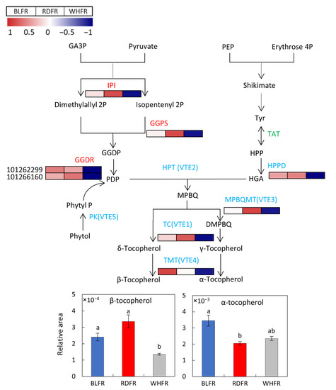 Ascorbic acid and tocopherol are two vitamins that catch consumers’ attention for their functional role as antioxidants, so there is great interest in developing horticultural crops with high concentrations of these compounds [92,93]. However, the ascorbic acid concentration is not improved by blue or red light (Figure 4). Tocopherols, a type of vitamin E, are considered as potent antioxidants. Vitamin E, and most particularly α-tocopherol. Plays an essential role in protecting the photosynthetic apparatus from photo-oxidative stress and photoinhibition [94]. α-Tocopherol is the prevalent form of vitamin E and the most biologically active form for humans. It is a potent nutrient that prevents atherosclerosis, cancer, and central nervous system disorders [92]. α-Tocopherol levels fluctuate in response to environmental stress [95,96]. As an important environmental factor, light conditions influence α-tocopherol concentration in plants, that is, high light treatment improves α-tocopherol and γ-tocopherol content in Arabidopsis [97]. Moreover, additional blue light can enhance α-tocopherol content in beet microgreen and harvested tomato fruit and γ-tocopherol concentration in parsley microgreen [72,98]. In this study, blue light has a similar influence that α-tocopherol levels were significantly elevated in BLFR (Figure 4). Therefore, blue light can enhance tocopherol accumulation in tomato fruit. Besides, the β-tocopherol level was higher in BLFR and RDFR than in WHFR. VTE4 is a member of the vitamin E-core pathway (Figure 11) and functions in shaping tocopherol composition [99,100]. Geranylgeranyl diphosphate reductase (GGDR) is also involved in vitamin E biosynthesis (MEP pathway), mediating the production of phytyl diphosphate (PDP) for vitamin E and chlorophyll biosynthesis [99,101]. The expression of enzyme genes in the vitamin E synthesis pathway, including these enzymes, was higher in BLFR or RDFR. Results suggested that blue light may increase α-tocopherol concentration and that blue or red light may increase β-tocopherol concentration, which are important for fruit quality, through the enhanced expression of genes in the vitamin E synthesis pathway in tomato fruit.