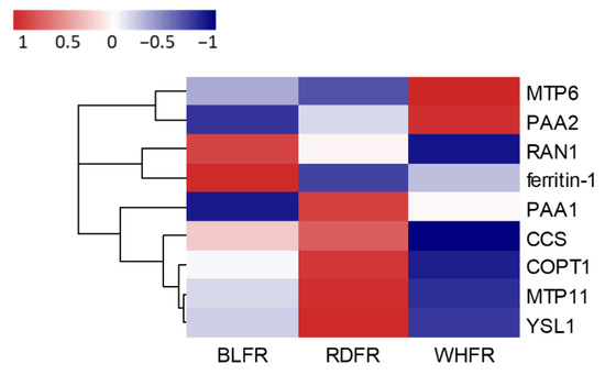 mRNA levels for genes involved in metal accumulation. Red and blue rectangles indicate higher and lower levels, respectively, than the mean of all treatments. Values indicate the z-score in the legend. Significant differences were found in the transcription level of MTP6, MTP11, YSL1, and COPT1 in RDFR vs. WHFR, ferritin-1 and PAA1 in BLFR vs. RDFR, PAA2 and CCS in WHFR vs. others, and RAN1 in all comparison pairs. BLFR, RDFR, and WHFR refer to blue, red, and white light-treated fruits, respectively.