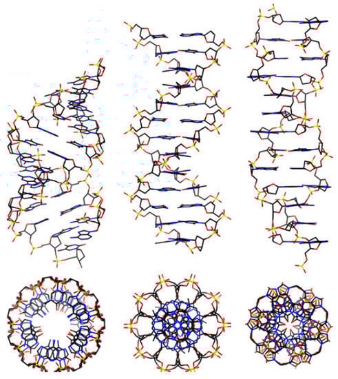From left to right, the structures of A-, B- and Z-DNA. The view of the double helix from above (or below) shows distinct symmetries, 11-fold for the A-DNA, 10-fold for the B-DNA and 6-fold for the Z-DNA [9,10].