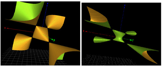 In Table 5, , and are taken in the two nucleotides G and C, forming eight triplets and the associated two-letter decamer sequences. Note that the triplet produces two distinct DNA conformations A and J. The character variety of the Hopf link HL (the Cayley cubic) is present in the factors of the ideal ring of the character variety in five cases over the nine possibilities, where one case (with triplet and code 1ZEY in the protein data bank) shows an algebraic surface similar to the Cayley cubic (with four simple singularities) as defined in Equation (3) and as shown in Figure 3 (right). We do not observe a clear correlation between the type of DNA conformation and the underlying HL topology, but the presence of HL in the variety seems to exclude the B-DNA conformation. In addition, the character variety always contains a surface of type in its factors.