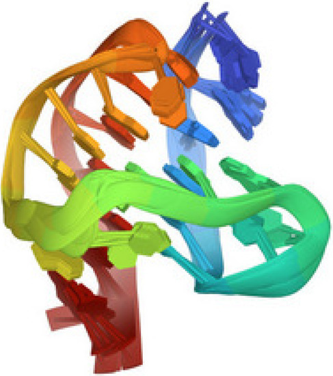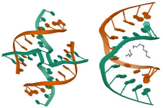 To summarize this section, no clear correlation is observed between the DNA conformations of the considered decamer and our group analysis. Longer sequences may be needed to obtain such a correlation. For instance, the two-letter DNA dodecamer sequence (PDB 2D47) corresponding to a complete turn of A-DNA—see Figure 5 (right)—features the polynomial (for HL) and a fourth-order polynomial similar to with four simple singularities, as announced at the end of Section 3.