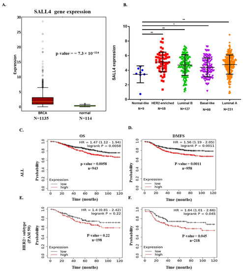 SALL4 expression analysis and prognostic value in breast cancer patients. (A) Boxplot to compare the RNA expression level of SALL4 in breast invasive carcinoma (BRCA) vs. normal breast tissue samples from the oncoDB database. (B) Gene expression analysis indicated the SALL4 expression level in the main intrinsic or molecular subtypes of breast cancer tissues from the TCGA database. Differential expression analysis is conducted with Student’s t-test, taking normal or low expression subtype as reference. (C–F) In-silico overall survival (OS) and distant metastasis-free survival (DMFS) analysis; (C,D) of SALL4 in all breast cancer patients (ALL) and (E,F) HER2+ subtypes patients from PAM50 database included in the Kaplan–Meier Plot tool. Patients were split by median value and the follow-up was 120 months. Student’s t-test compared the results. * p-value ≤ 0.05 and ** p-value ≤ 0.01.
