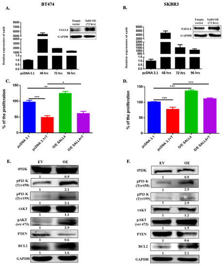 SALL4 induces proliferation by following PI3K/AKT pathway. (A,B) RT-qPCR and Western blot results show the overexpression efficiency of a plasmid (pcDNA3.1+/SALL4) for SALL4 in both HER2+ cell lines such as BT474 and SKBR3. (C,D) The proliferation of BT474 and SKBR3 cells with overexpression of SALL4 was measured by WST assay at 7 days. The graph shows the results of three independent experiments. Student’s t-test compared the results. * p-value ≤ 0.05, ** p-value ≤ 0.01 and *** p-value ≤ 0.001. (E,F) Protein expression levels were analyzed by Western blot following 72 h of transfection of plasmid for overexpression of SALL4. Expressions of PI3K/AKT pathway proteins, including PI3K, phospho-PI3 kinase (Tyr458 and Tyr199), phospho-Akt (Ser473), PTEN and BCL2 were shown. GAPDH expression was used as an internal control. The densitometry quantification was obtained by normalizing to GAPDH and for quantifying phosphorylation protein the data were obtained by taking the ratio of phosphorylated protein upon total protein. EV: Empty Vector: OE: Overexpression of SALL4.T: trastuzumab treatment.