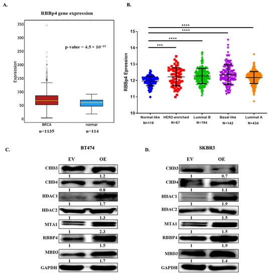 Expression of RBBp4 in public database and regulation of NURD complex through SALL4. (A) Boxplot to compare the RNA expression level of RBBp4 in breast invasive carcinoma vs. normal breast samples from the oncoDB database. (B) Gene expression analysis indicated the RBBp4 expression level in five main intrinsic or molecular subtypes of breast cancer tissues from the TCGA database. (C, D) Protein expression analysis of NURD complex members by upregulating SALL4 expression. Student’s t-test compared the results. *** p-value ≤ 0.001 and **** p-value ≤ 0.0001. EV: Empty Vector: OE: Overexpression of SALL4.