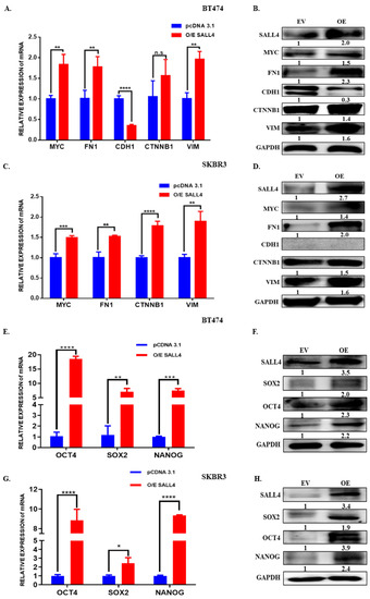 Considering that SALL4 is a TF that has been reported to play an essential role in maintaining stem cell-like states and leading to EMT processes, we evaluate EMT and stemness markers in BT474 and SKBR3 cell lines that ectopically overexpressed SALL4. The SALL4 gain of function in HER2+ cell lines induced a significant reduction in the epithelial marker CDH1 expression, whereas the expression of the mesenchymal-like β-catenin (CTNNB1), vimentin (VIM) and fibronectin (FN1) have increased in both mRNA and protein level. Furthermore, it has been also observed that MYC, an essential TF for regulating EMT and/or cancer stem cells, showed increased expression (Figure 4A–D). Meanwhile, we observed the opposite effect in the resistance cell line when we silenced the SALL4 expression (Figure S4A,B). As EMT and stemness are interlinked processes, we also evaluated the expression of some stemness markers and observed that OCT4, SOX2 and NANOG were upregulated in HER2+ BC cell lines that ectopically overexpressed SALL4 (Figure 4E–H). In contrast, those stemness markers were downregulated when silencing SALL4 in the trastuzumab-resistant cells (Figure S4C,D). These results suggest that overexpressing of SALL4 promotes EMT and stemness, which is required for the cells to be more aggressive and able to resist treatments.