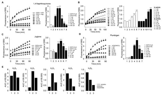 Naphthoquinones oxidize H2S to polysulfides (SSP4 fluorescence). (A) Effect of increasing concentrations of 1,4-naphthoquinone (1,4-NQ) with constant 300 μM H2S, or (B) effect of 10 and 30 μM 1,4-NQ with increasing concentrations of H2S. (C,D) Effect of increasing concentrations of juglone (Jug) or plumbagin (Pbn) on SSP4 fluorescence from 300 μM H2S. All naphthoquinones initially increased, then decreased SSP4 fluorescence, whereas H2S concentration-dependently increased fluorescence at both concentrations of 1,4-NQ. (E) LC-ESI-HRMS identification of IAM-derivatized polysulfides produced from 1 mM H2S and 1 mM 1,4-NQ. Samples were derivatized after 10 min with 5 mM IAM and three aliquots (1, 2, 3) were analyzed serially at approximately 1 h intervals. (A–D) Mean + SE, n = 4 wells per treatment. *, p < 0.05; **, p < 0.01; ***, p < 0.001 compared to buffer; ##, p < 0.01; ###, p < 0.001 compared to maximum response.