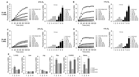 (A–D) Effects of oxygen (O2; 21% and <1%) and superoxide dismutase (SOD; 0.1 μΜ) on polysulfide production (SSP4 fluorescence) by 10 μM or 30 μM 1,4-NQ and 300 μΜ H2S. Low O2 had minimal effects on polysulfide production, whereas SOD increased production in both 21% and <1% O2. Overall polysulfide production was greater with 10 μM than with 30 μM 1,4-NQ. Bar graphs show fluorescence at 110 min. (E) Effects of SOD on polysulfide production by 10 μM or 30 μM NQs incubated with 300 μM H2S for 120 min. Mean + SE, n = 4 wells per treatment; *, p < 0.05; ***, p < 0.001 compared to similar treatment without SOD. ###, p < 0.001 compared to maximum response.