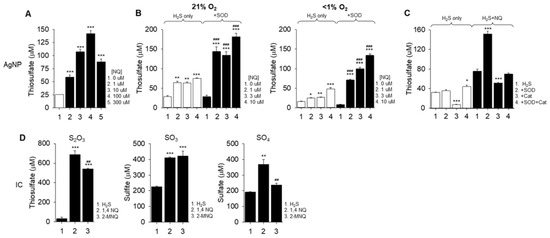 We have observed that, in addition to polysulfides, a variety of quinones oxidize H2S to thiosulfate, sulfite and sulfate [,,]. Although we did not perform an extensive analysis of all possible sulfoxides that could be produced by the NQ/H2S reaction, we show that sulfite, sulfate and thiosulfate are produced.