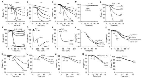 Typical real-time traces of O2 consumption by naphthoquinones under various conditions. (A–C) O2 is concentration-dependently consumed during incubation of 300 μM H2S with increasing concentrations of (A) 1,4-naphthoquinone (1,4-NQ), (B) juglone (Jug) or (C) plumbagin (Pbn). (D) 100 μM 1,4-NQ does not consume O2 in the absence of H2S. (E,F) H2S concentration-dependently increases O2 consumption by 10 μM (E) and 30 μM (F) 1,4-NQ. (G,H) O2 levels begin to rise after prolonged incubation of 30 μM 1,4-NQ with 300 μM H2S and they are decreased upon subsequent addition of H2S (G) but not by 1,4-NQ (H). (I) H2O2 (100 μM) does not affect O2 consumption in the presence of 300 μM H2S or H2S plus 10 μM 1,4-NQ. (J) Superoxide dismutase (SOD, 0.1μM) increases O2 consumption by 300 μM H2S and 10 μM 1,4-NQ, whereas catalase (Cat. 1 μM) decreases it and Cat reduces the effect of SOD. O2 consumption by 300 μM H2S and 30 μM menaquinone (vitamin K2; K), 2-methoxy-1,4-NQ (2-MNQ; L), anthraquinone (M), phylloquinone (vitamin K1; N) and lawsone (O).