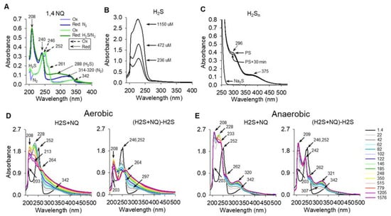 (A) Absorbance spectra of oxidized 1,4-NQ (60 μM, light blue/green lines) and after reduction with either N2 gas (dark blue line) or 1 mM H2S, followed by N2 gas to remove excess H2S (dark green line). (B) Spectra of different concentrations of H2S (as Na2S); (C) spectra of mixed polysulfides (H2Sn) produced by anaerobic incubation of Na2S with powdered sulfur (S8) in 200 mM phosphate buffer (pH 7.4). Numbers indicate approximate wavelength of peaks. (D,E) Absorbance spectra as a function of time of the reaction between 230 μM 1,4-NQ and 115 μM H2S in aerobic (21% O2) and anaerobic (<1% O2) buffer. Left panels (H2S + NQ) of each pair show the full spectra, in the right panels (H2S + NQ) − H2S) the H2S spectrum was subtracted from the H2S + NQ spectrum at each time point. The time, in seconds, after addition of H2S is indicated on the right of panel (E).