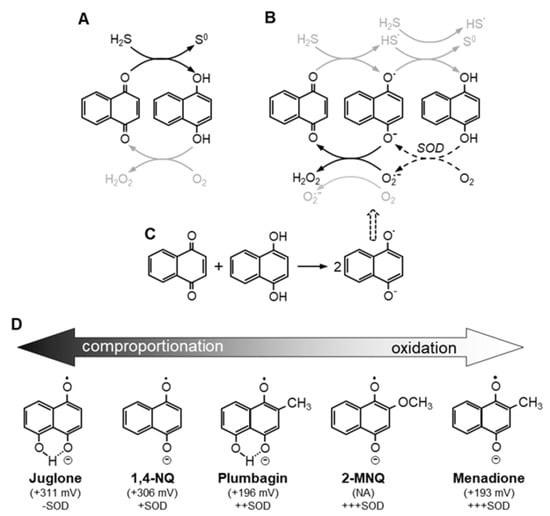 Proposed two-electron (A) and one-electron (B) reactions of 1,4-NQ with H2S and (C) the comproportionation reaction generating the semiquinone from oxidized and reduced 1,4-NQ. Gray arrows and chemical pathways indicate less favorable reactions, dashed gray arrows show pathway enhanced by SOD-catalyzed removal of superoxide. (D) Potential effects of ring substitutions on autoxidation or comproportionation in the initial one-electron oxidation of naphthohydroquinones. Naphthoquinones that readily comproportionate are minimally affected by SOD. Reduction potentials in in parentheses, -SOD, minimal effect of superoxide dismutase (SOD). +SOD, +++SOD moderate and large effect of SOD, respectively.