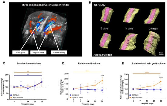 Volume measurements in the vein grafts of C57BL/6J and ApoE3*Leiden mice over time. (A) A three-dimensional color Doppler maximal intensity projection of the neck region of a vein grafted mouse. The nearest panel of the cube depicts the caudal side. (B) Representative vein graft three-dimensional renders of C57BL/6J mice and ApoE3*Leiden mice, depicting vascular remodeling over time. (C–E) Graphical representations of, respectively, lumen volume (C), wall volume (D), and total vein graft volume (E) of C57BL/6J (n = 7, chow diet) and ApoE3*Leiden mice (n = 7, high-fat diet), calculated relative to their baseline measurements at t = 3 days post-surgery. Total vein graft volume is a measure for outward remodeling. Volume calculations were corrected through a volume-per-length approach. Statistics: ANOVA mixed model, corrected for multiple testing; * p < 0.05, ** p < 0.01, *** p < 0.001, **** p < 0.0001.