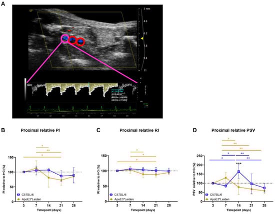 Blood flow velocity indices in vein grafts of C57BL/6J and ApoE3*Leiden mice over time. (A) Flow pattern of the proximal part of a murine vein graft (pink), with the middle and distal part of the vessel showing in red. The velocity–time curve of the proximal part of the vein graft is depicted in yellow, including its semi-automatically calculated velocities (white) and end-diastolic velocity (blue). (B–D) Graphical representations of the proximal PI, RI, and PSV, calculated relative to their baseline measurements at 3 days post-surgery in vein grafts of C57BL/6J and ApoE3*Leiden mice. Statistics: ANOVA mixed model, corrected for multiple testing; * p < 0.05, ** p < 0.01, *** p < 0.001.
