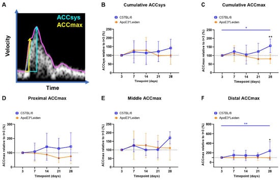 Acceleration measurements are used in the clinic for vascular remodeling [22,23], and have been previously inaccessible in mice. To longitudinally quantify blood flow acceleration in vein grafts of C57BL/6J and ApoE3*Leiden, ACCsys and ACCmax were identified (Figure 4A) [24,25].