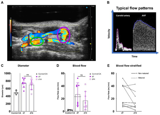Diameter and blood flow rate measurements in AVFs in C57BL/6J mice over time. (A) Two-dimensional color Doppler recording of a murine AVF, with a pink oval indicating the location of anastomosis measurements and a green oval indicating the location of inflow artery measurements. (B) A typical velocity–time curve in a carotid artery (Control CA) and AVF in C57BL/6J mice. (C) Lumen diameter of control carotid arteries (n = 5) and murine AVFs (site of anastomosis) (n = 8) at 7 and 14 days after surgery. (D) Blood flow rate measurements of control carotid arteries (n = 5) and AVFs (n = 5) on 7 and 14 days after surgery. The dotted line indicates the cut-off value for fistula maturation (23 mL/min) (E) Blood flow rate measurements in the AVFs, stratified for AVF maturation or non-maturation at t = 7 days. Statistics AVF over time: paired t-test.