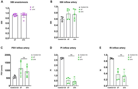 To assess the flow disturbance at the site of anastomosis in both blood vessels, an important contributor to AVF maturation, spectral broadening was determined as an index normalized to the PSV. Following the AVFs over time, a stable SBI was observed at the site of the anastomosis as well as the inflow artery at 7 and 14 days post-surgery (Figure 6A,B).