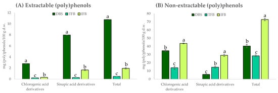 Contents of individual (poly)phenols (chlorogenic acid derivatives and sinapic acid derivatives) and the total contents of (poly)phenols determined as the sum of the individual compounds (mg/100 g d.w.): (A) extractable phenolics (EPP) and (B) non-extractable phenolics (NEPP), analysed by HPLC-DAD for freeze-dried broccoli stalk (■DBS), the total fibre fraction (■TFB) and the insoluble fibre fraction (■IFB). Values are expressed as mean ± SD (n = 3). Different letters (a–c) indicate significant differences among the samples (p < 0.05) for each individual group and the total (poly)phenols.