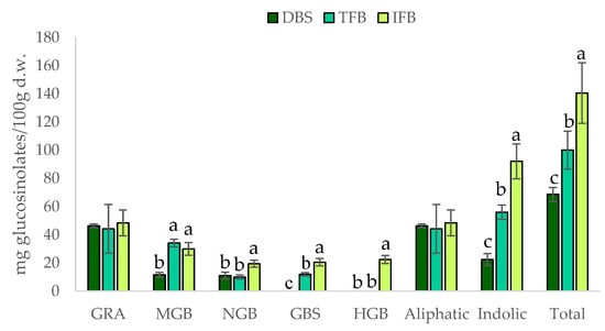 Contents of glucosinolates (mg/100 g of d.w.), analysed by HPLC-DAD, of freeze-dried broccoli stalk (■DBS), the total fibre fraction (■TFB) and the insoluble fibre fraction (■IFB). Glucosinolates are presented as individual compounds (GRA: glucoraphanin (4-methylsulphinybutyl-gls), MGB: 4-methoxyglucobrassicin (4-methoxy-3-indolylmethyl-gls), NGB: neoglucobrassicin (1-methoxy-3-indolylmethyl-gls), GBS: glucobrassicin (3-indolylmethyl-gls), HGB: 4-hydroxyglucobrassicin (4-hydroxy-3-indolylmethyl-gls)). Values are expressed as mean ± SD (n = 3). Different letters (a–c) indicate significant differences (p < 0.05) among the samples for each individual glucosinolate and the total glucosinolates.