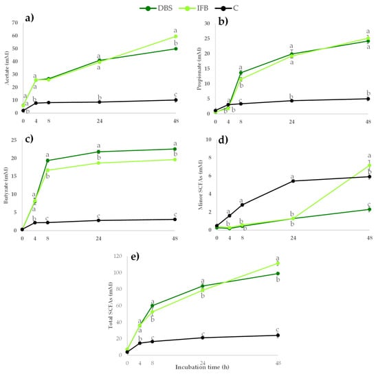SCFAs production (acetate (a), propionate (b), butyrate (c), other minor SCFAs (isobutyrate, isovalerate, valerate, isocaproate, caproate and heptanoate) (d) and total SCFAs (e)) (mM) during in vitro fermentation of samples obtained from broccoli stalk. Freeze-dried broccoli stalk (●DBS); the insoluble fibre fraction (●IFB); the control (●C). Values are expressed as mean ± SD (n = 3). Different letters (a–c) indicate significant differences (p < 0.05) among the samples at the same incubation time.