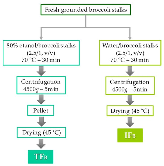 For the extraction of TFB, the broccoli stalks were ground in a Thermomix TM-31 and mixed with 80% ethanol, at a ratio of 1/2.5 (m/v) (Figure 4). The ethanol (80%) was previously heated to 70 °C to facilitate the precipitation of the soluble and insoluble components and to inactivate myrosinase. Each mixture was stirred for 30 min and then centrifuged at 4500× g for 5 min; the resulting pellet was left on a convection drying oven at 45 °C until it reached a constant weight. To obtain the IFB fraction, broccoli stalks were mixed with water, previously heated to 70 °C to inactivate myrosinase, at a ratio of 1/2.5 (m/v) and then stirred for 30 min (Figure 4). Each extract was centrifuged at 4500× g for 5 min and the resulting pellet was left on a convection drying oven at 45 °C until it reached a constant weight. The dried samples were crushed separately and stored at −20 °C.